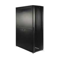 Tripp Lite SR45UBDP 45U deep rack enclosure offers 1200mm depth for high-density equipment. Features front/rear locking doors, half-size removable side panels, split rear door, top vented panel, open bottom, and supports 3000 lb. Includes casters and levelers for easy positioning.Features