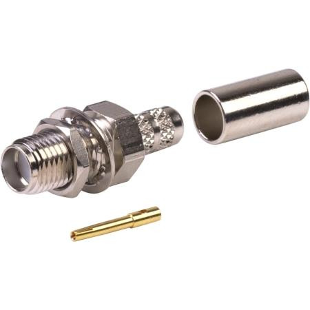 RF Industries RSA-3252-C SMA female bulkhead connector designed for RG58 and 8219 cables. Features crimp termination for secure RF connections in communication and radio applications.Technical Specs