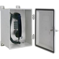Heavy-duty GAI-TRONICS NEMA 4X gray telephone featuring a noise-cancelling microphone, hearing aid compatible receiver, and a 6-foot Hytrel coiled cord for durability and clear communication in harsh environments.Features