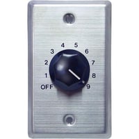 SPECO 50W speaker line attenuator with 70/25V input, designed as a wall plate volume control in silver and black finish. Ideal for adjusting volume in public address and audio systems.Features