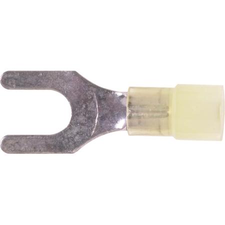 Durable HAINES nylon-insulated fork terminals fit 12-10 AWG wires with 1/4" studs. Ideal for secure electrical connections. Package contains 100 terminals for reliable spade crimp lug use.Technical Specs