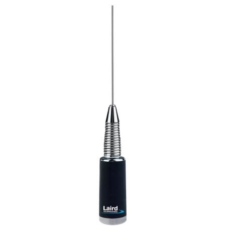Laird CW1503S 5/8 wave base loaded antenna covers 150-162 MHz with 3 dB gain. Features a 48.5 in chrome whip, black coil base, and spring. Supports up to 200W power. NMO mount sold separately. Ideal for VHF mobile use.Technical Specs