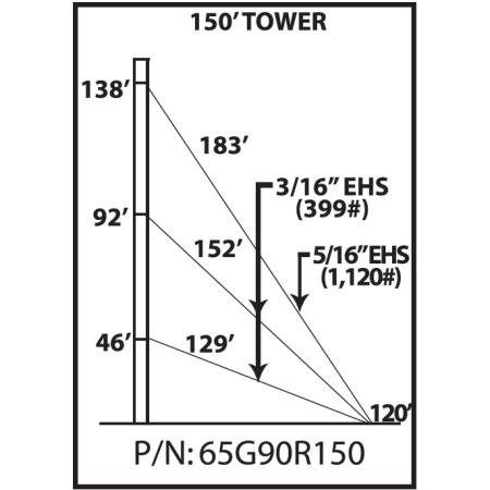 ROHN 65G guyed tower kit, 150 ft tall, includes sections, base plate, side arms, guy wires, anchor rods, and grounding kits. Designed for 90MPH Rev G / 70MPH Rev F wind ratings, ideal for durable and stable antenna support.Technical Specs