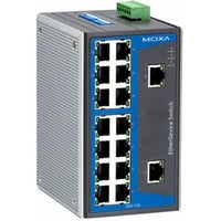 MOXA Industrial unmanaged Ethernet switch features 16 10/100BaseT(X) ports, IP30-rated aluminum enclosure, operates from 0 to 60°C, and supports 12-45VDC redundant dual power input for reliable network performance.Technical Specs