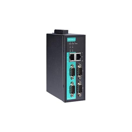 MOXA 4-port RS-232/422/485 serial device server featuring 10/100MBaseT(X) Ethernet, 1KV serial surge protection, and wide operating temperature from -40°C to 75°C.Technical Specs
