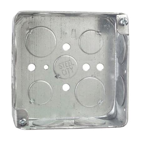 Carlon 52151 steel electrical box measuring 4x4 inches with 1.5-inch depth. Features 1/2-inch and 3/4-inch knockouts. Made of pre-galvanized steel for durability and corrosion resistance.Features