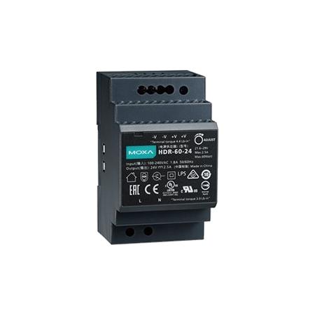 MOXA 60W 2.5A DIN-rail power supply with 24V DC output, universal input 85-264VAC/120-370VDC, operating temperature -30 to 70°C, ideal for industrial applications.