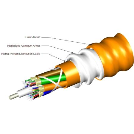 COMMSCOPE P-006-DZ-8W-FSUYL six-fiber OS2 single-unit plenum distribution cable with interlocking aluminum armor and plenum-rated jacket for enhanced protection and fire safety.Features