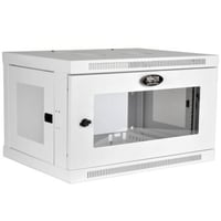 Tripp Lite SRW6UWG is a 6U low-profile wall mount rack cabinet in white, supporting 19" EIA standard equipment up to 16.5" deep. Made of heavy-duty steel with a 200 lb load capacity, it features a lockable acrylic front door, vented panels, reversible door, and cable management ports.Technical Specs