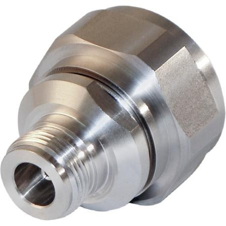 RF Industries P2RFD-1671-SS adapter features 7/16 DIN male to N female connectors with low PIM performance. It has a straight barrel design, white bronze (tri-metal) plating, and a stainless steel coupling nut for durability and reliable RF connections.Technical Specs