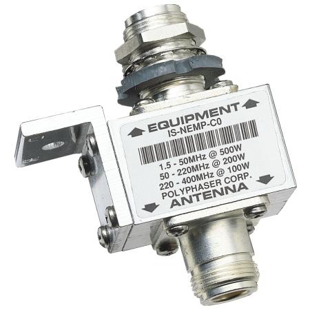 POLYPHASER IS-NEMP-C0 bulkhead EMI/RFI surge protector with threaded N connector. Covers 1.5 – 400 MHz frequencies. Supports 50,000 A surge current and 314 µJ throughput energy, ideal for EMP transmit protection.Technical Specs