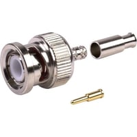 Nickel-plated BNC male connector with gold-plated center pin for RG174 cable. Features crimp-on center pin and braid termination with large ferrule for secure, reliable RF connections.Technical Specs