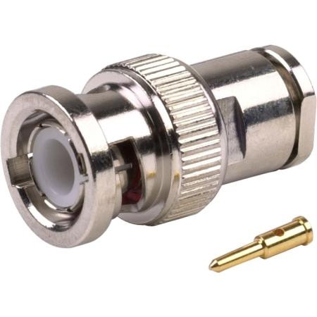 RF INDUSTRIES RFB-1100-2 BNC Male connector compatible with RG58/U, RG58A/U, RG141, and Ultralink cables. Features a nickel-plated body, gold-plated solder center pin, and clamp-on braid for secure connections.Technical Specs