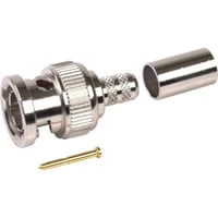 RF Industries RFB-1707-D BNC male crimp connector for RG59 and LMR240-75 cables. Features a nickel-plated body and gold-plated pin. Supports 75 Ohm impedance, compatible with various cable models for reliable RF connections.Technical Specs