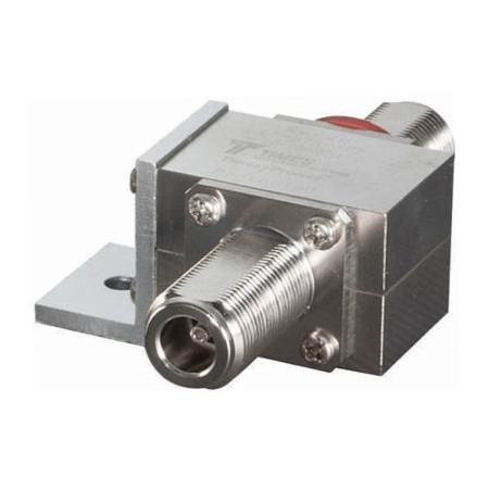 TIMES MICROWAVE LP-BTR-NFF-B bulkhead and flange mount arrestor covers 20-1000 MHz with 10 kA surge capacity and 200 uJ throughput energy. Features N Female connectors and a grounding bracket aligned with connectors for efficient grounding.Technical Specs
