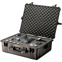 Pelican 1600 waterproof electronics case, 21.75x16.8x7.9 in, watertight to 30 ft. Made of lightweight resin with Neoprene O-ring seal, automatic purge valve, double throw latches, stainless steel hardware, padlock protector, and rubber grip handle. ATA-approved.Technical Specs