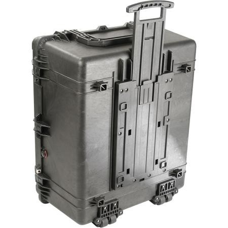 Pelican 1690 black equipment case measures 30.01x25.02x16.01 inches. Waterproof, airtight to 30 ft, with neoprene O-ring, purge valve, double throw latches, polyurethane wheels, and retractable...