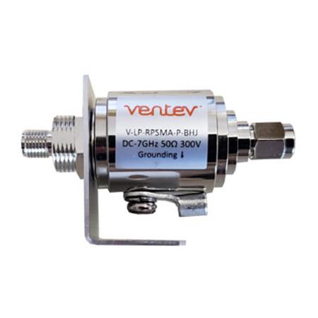VENTEV 0-7 GHz lightning arrestor featuring RPSMA male to RPSMA female bulkhead connectors, gas tube protection, and DC pass capability. Designed to protect RF equipment from lightning strikes and surges.Technical Specs