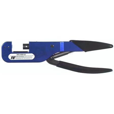 Heavy-duty piston-type ratcheting cable crimper frame by RF Industries in blue/black. Compatible with interchangeable dies (sold separately) for crimping large ferrules and low loss 0.6 in diameter cables like Times Microwave LMR and Andrew Solutions connectors.Technical Specs