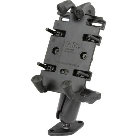 RAM MOUNTS RAM-B-102-PD3U double ball mount features a 2-hole diamond plate base with AMPS pattern, double socket arm, and Quick-Grip spring-loaded phone holder. Adjustable with one knob for optimal phone positioning on flat surfaces or RAM Tough-Tray sides.Features