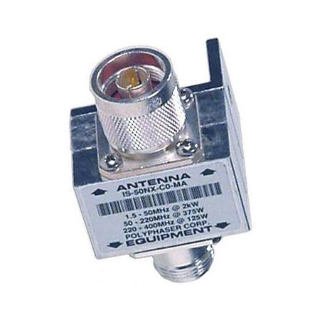 POLYPHASER 1.5-700 MHz general coverage flange mnt. lightning protector. 50K amp surge. <10mJ throughput energy. N M on antenna port, N F on equip. port