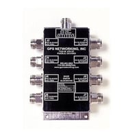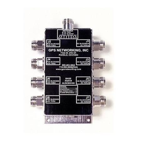 GPS NETWORKING ALDCBS1X8 is an active GPS splitter with 1 input and 8 outputs, covering all GNSS L-band frequencies. It features internal amplification, DC pass-through on output 1 to power the antenna, and DC-blocked outputs 2-8 with 200 Ohm loads to prevent false alarms.Technical Specs