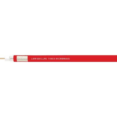 LMR-600-LLPX 1/2" 50 Ohm coaxial cable with plenum-rated red CATV-P jacket. UL/NEC CMP and CSA FT6 rated. Features stranded outer conductor, copper-clad aluminum center, 9.3 GHz max frequency, -40°C to 125°C range, UV and chemical resistant, ideal for in-building use.Features