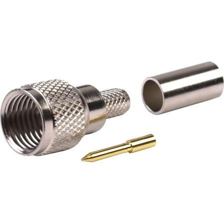 Mini UHF Male crimp connector by Times Microwave for LMR-200 cable. Features silver-plated body, gold-plated solder center pin, and crimp-on braid for secure connection.Technical Specs