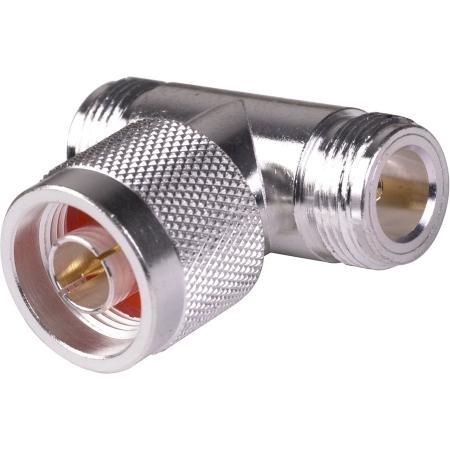 RF Industries RFN-1010-1 T adapter with double N female connectors and one N male connector. Ideal for RF applications requiring signal splitting or combining with durable construction.Technical Specs