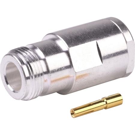 RF Industries RFN-1024-1SI N Female connector for Belden 8214, 9913, 9914, and LMR400 cables. Features silver-plated body, gold-plated solder center pin, and clamp-on braid for secure connections.Technical Specs