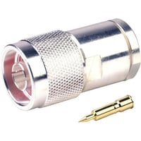 RF INDUSTRIES RFN-1002-1SI N Male connector for Belden 9913, 9914, 8214, and LMR400 cables. Features silver-plated body, gold center pin, solder center pin, and braid clamp for secure connection.Technical Specs