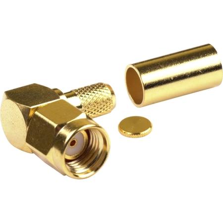 RF Industries RP-3010-1C right angle RP-SMA male connector with gold-plated body and pin. Compatible with RG58, RG141, and Times LMR195 cables. Crimp-style termination ensures secure and reliable RF connections.Technical Specs