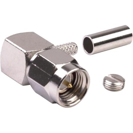 RF INDUSTRIES RSA-3010-B SMA male right angle connector with solder center pin, compatible with RG174, RG188, RG188A, and RG316 cables for reliable RF connections.Technical Specs