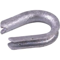 Heavy-duty 3/16" open thimble made of galvanized steel, designed for 3/16" wire rope and guy strand. Meets ASTM A153 and Federal Specs FF-T-276B Type III for corrosion resistance and durability. Easy installation with open design.Features