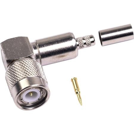 RF Industries RFT-1218-C2 TNC male right angle crimp connector for LMR-200 and LMR-194 cables. Features nickel-plated body, gold-plated center pin, and Teflon dielectric for reliable RF connections.Technical Specs