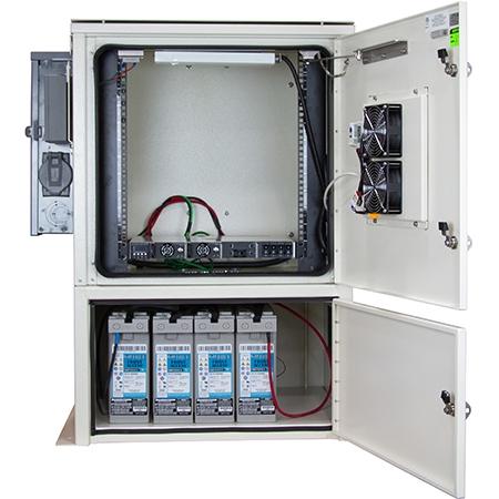 VENTEV NEMA 3R broadband enclosure features SOL Shield magnetic door alarm, dual 100 CFM fans, 100A load center, 19" or 23" rack rails, battery compartment, and 700W redundant rectifier. Cream color, designed for -48 VDC rectifier systems.Technical Specs