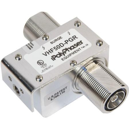 POLYPHASER VHF50D-MA-PGR surge protector with 7/16 DIN M/F connectors supports 100-512 MHz, 750W power, DC block, low PIM -150 dBc, IP67 rating, 20kA surge current, and bracket hole mount for reliable RF lightning protection.Technical Specs